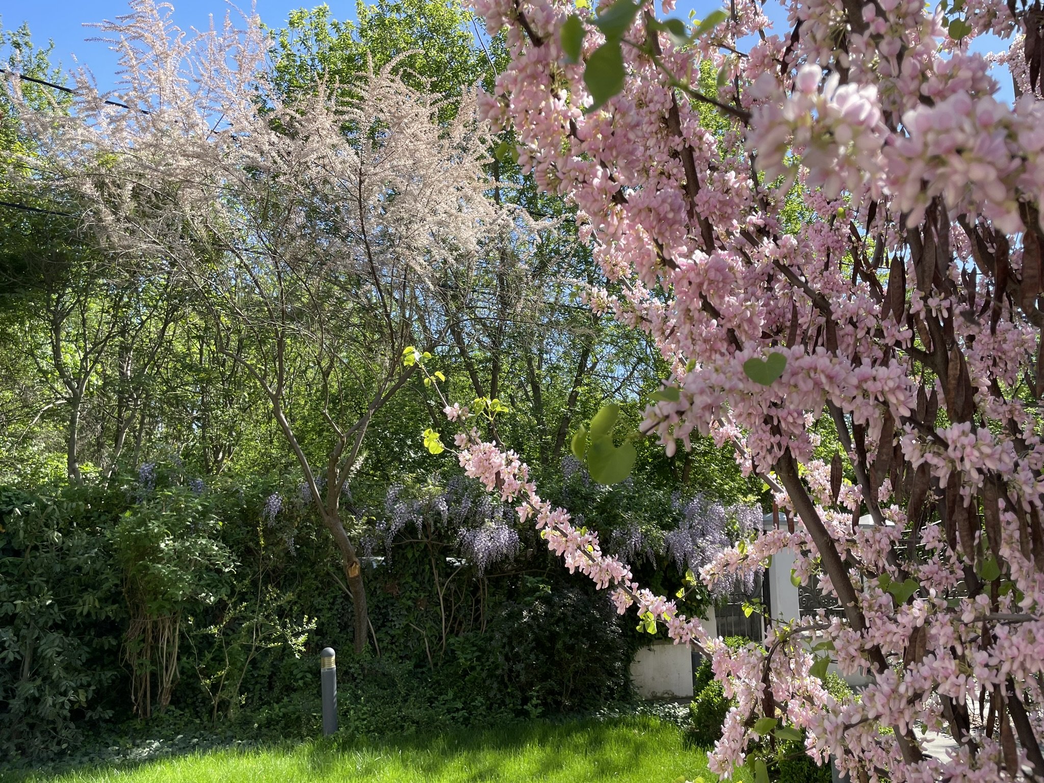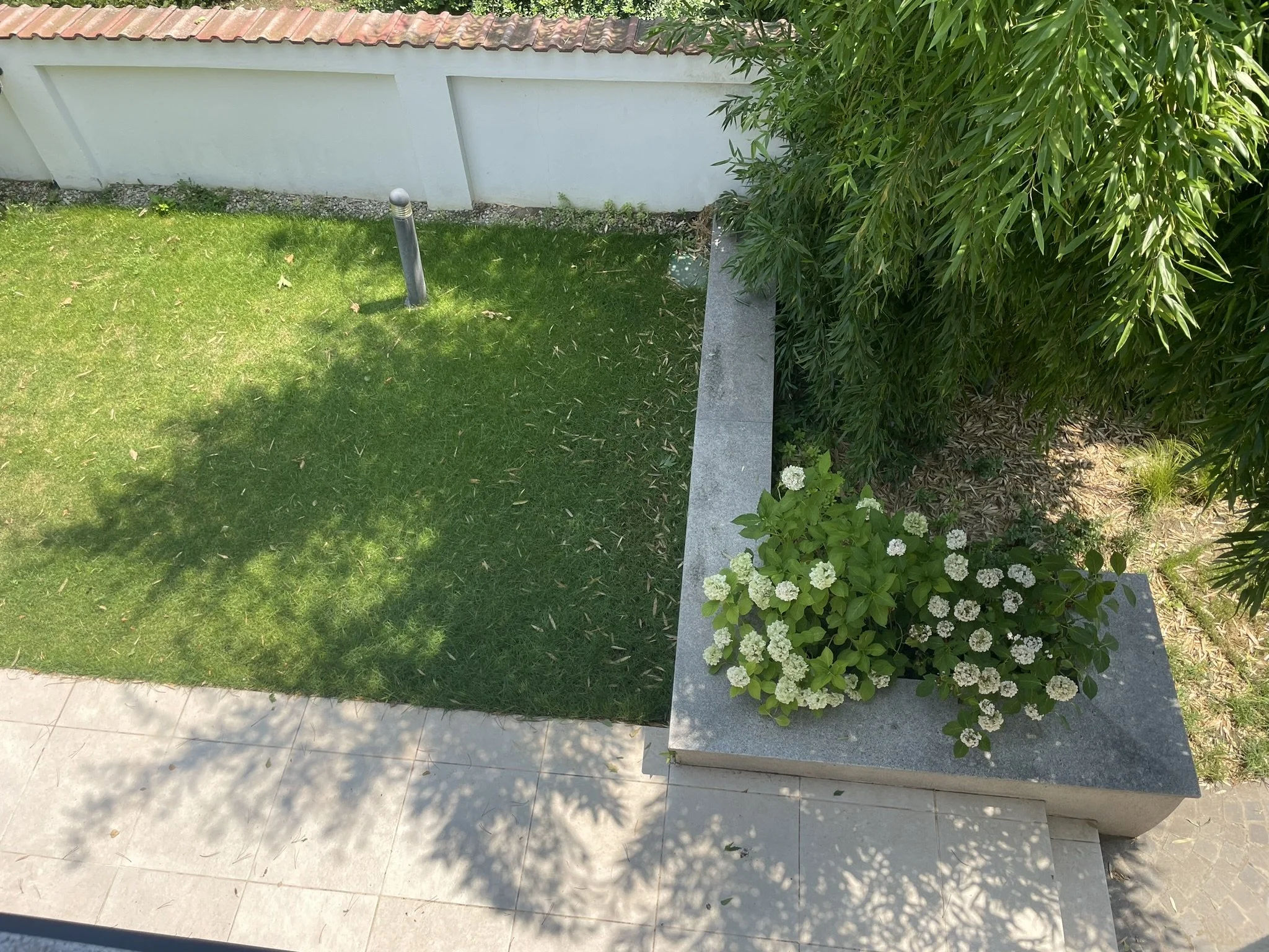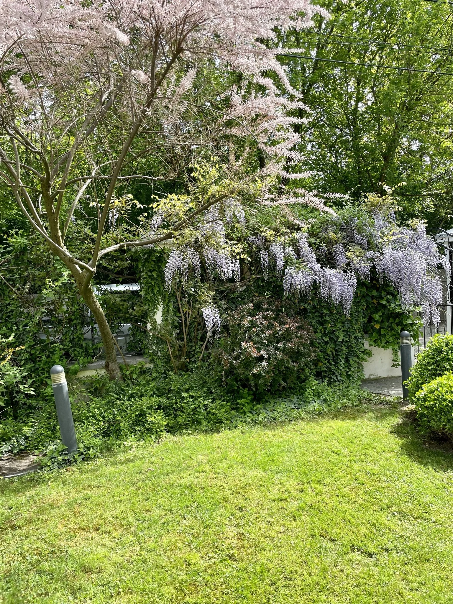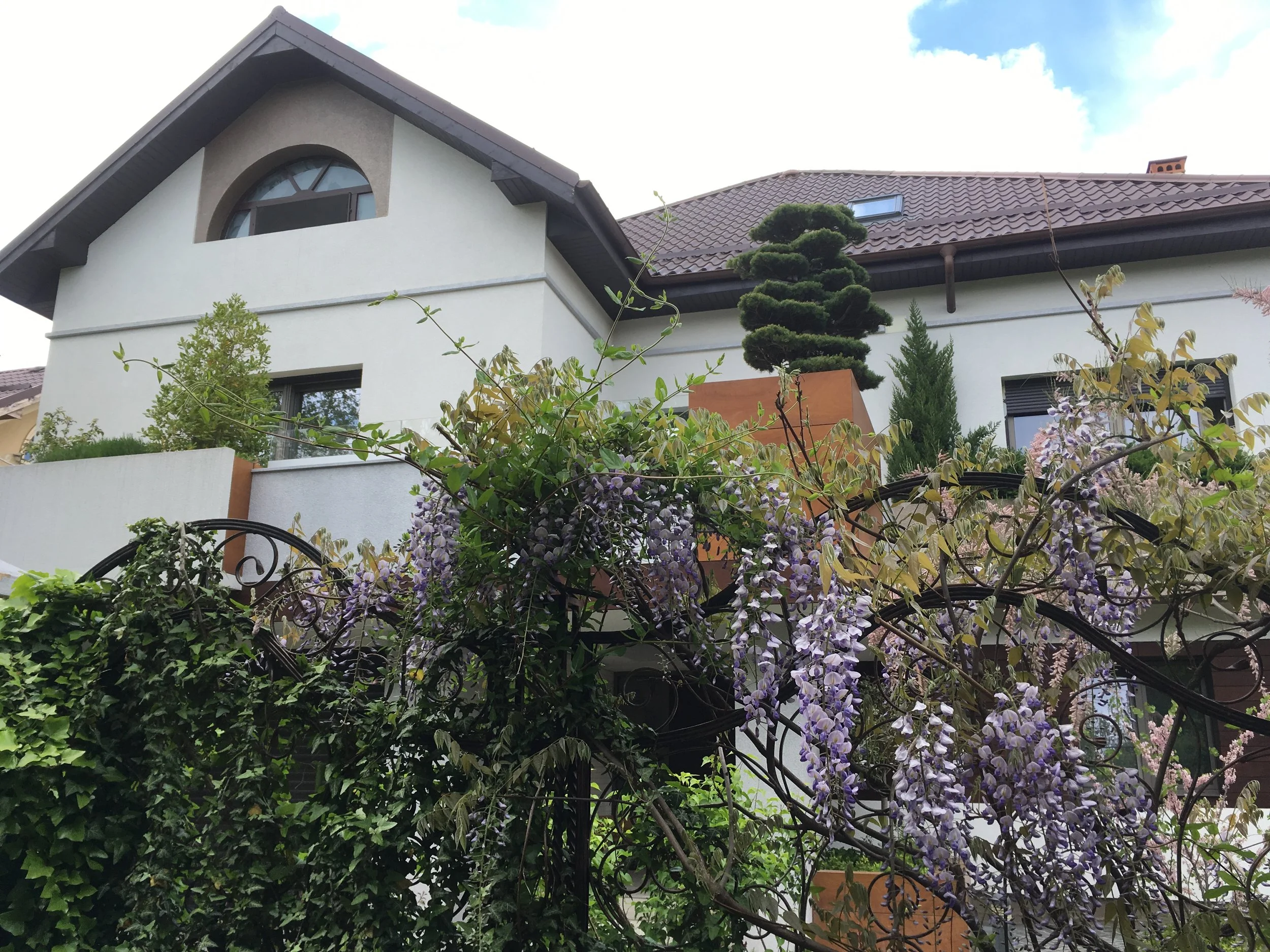 The lush garden quietly surrounds the home, creating a biodiverse refuge in the north of Bucharest.