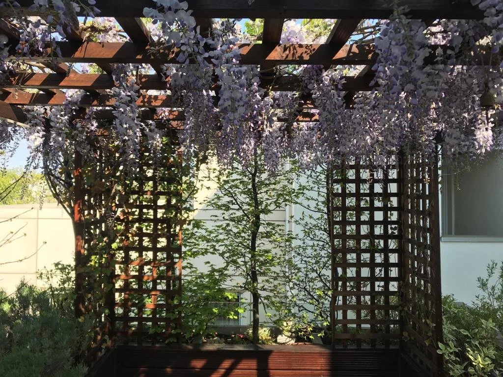 A sun-drenched terrace transformed into an intimate space with a pleasant microclimate, rich colours, and a notable increase in biodiversity — supporting pollinators and local fauna. Discovery voyage for young and old among lavender, wisteria and pine trees.